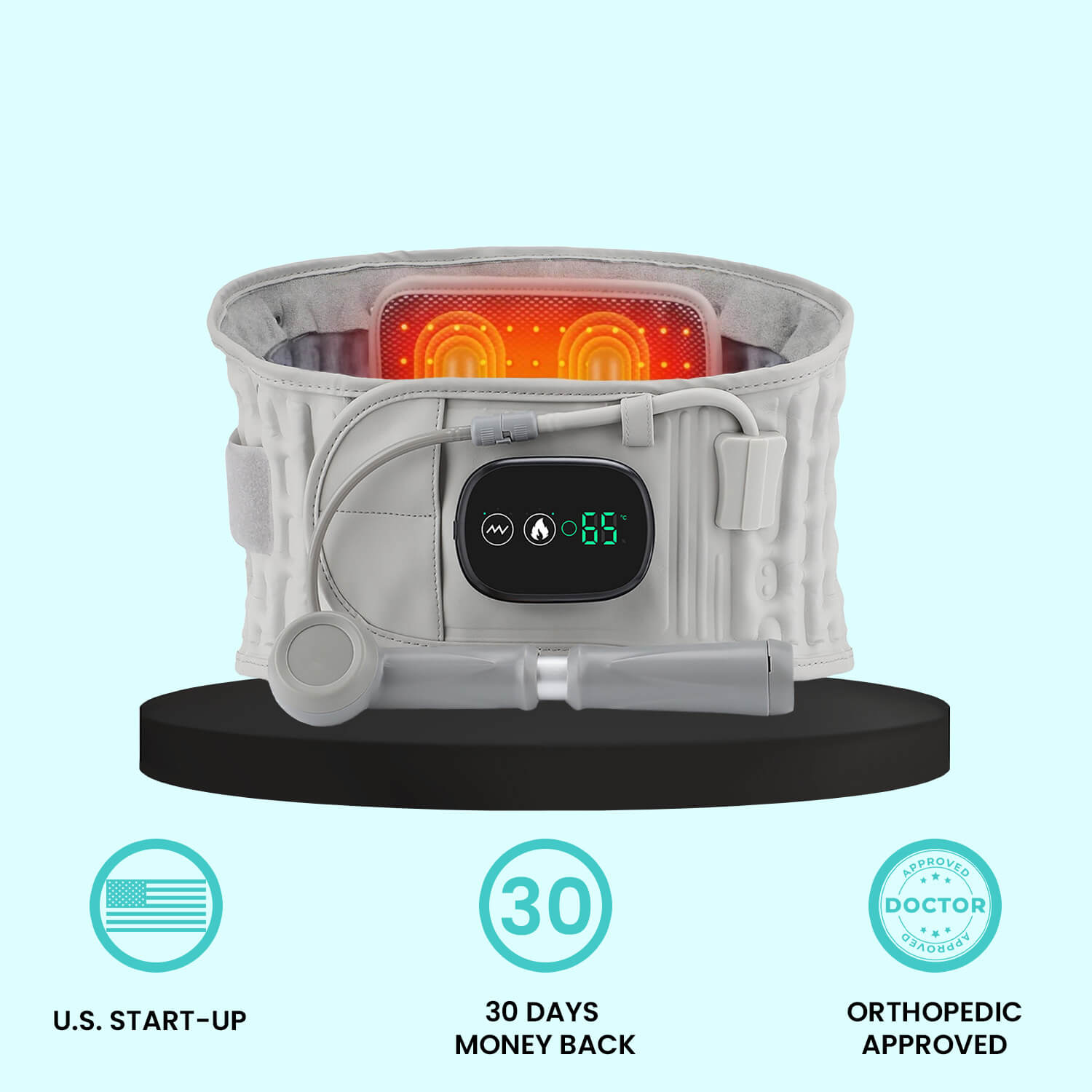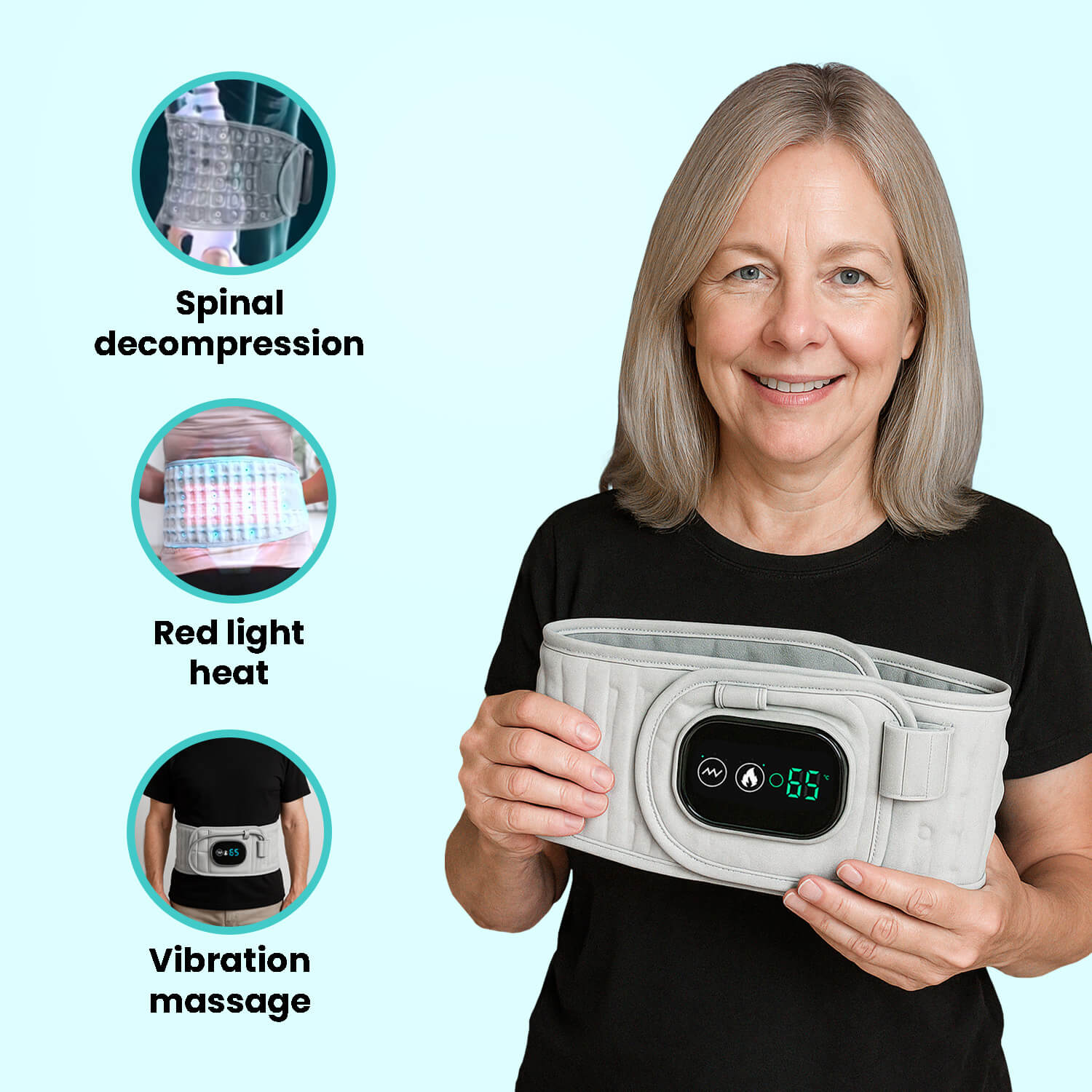 The belt combines spinal decompression, heat therapy, vibration massage, and red light therapy to target the root causes of lower-back pain. It gently lifts and stretches the lumbar spine, improves circulation, relaxes tight muscles, reduces inflammation, and eases pressure on irritated nerves, giving you fast relief and better mobility.