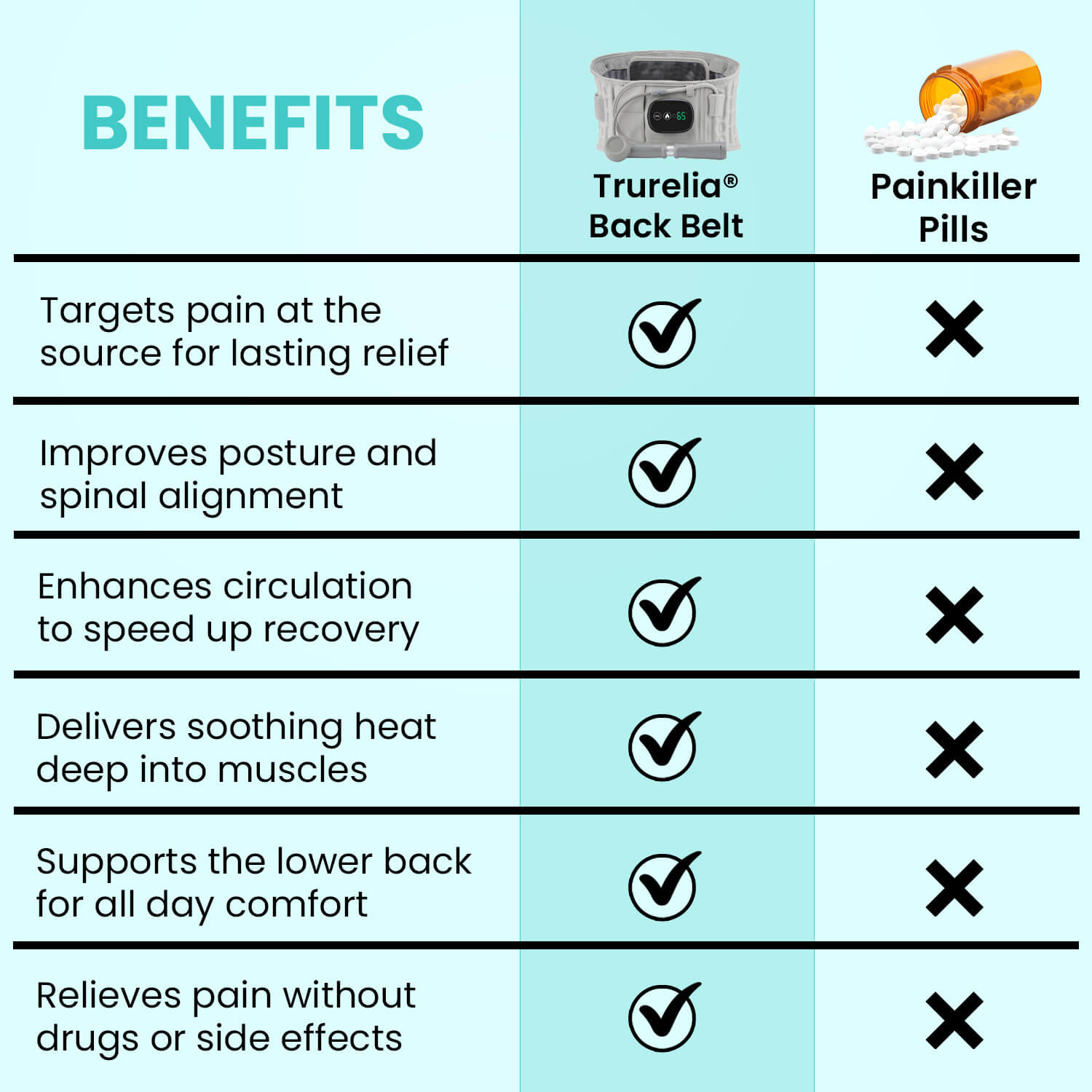 Using the Trurelia® Back Belt for just 15 minutes a day helps ease muscle tension, increase blood flow, reduce nerve compression, and restore mobility through the combined benefits of vibration massage, heat therapy, spinal traction stretch, and red-light support.