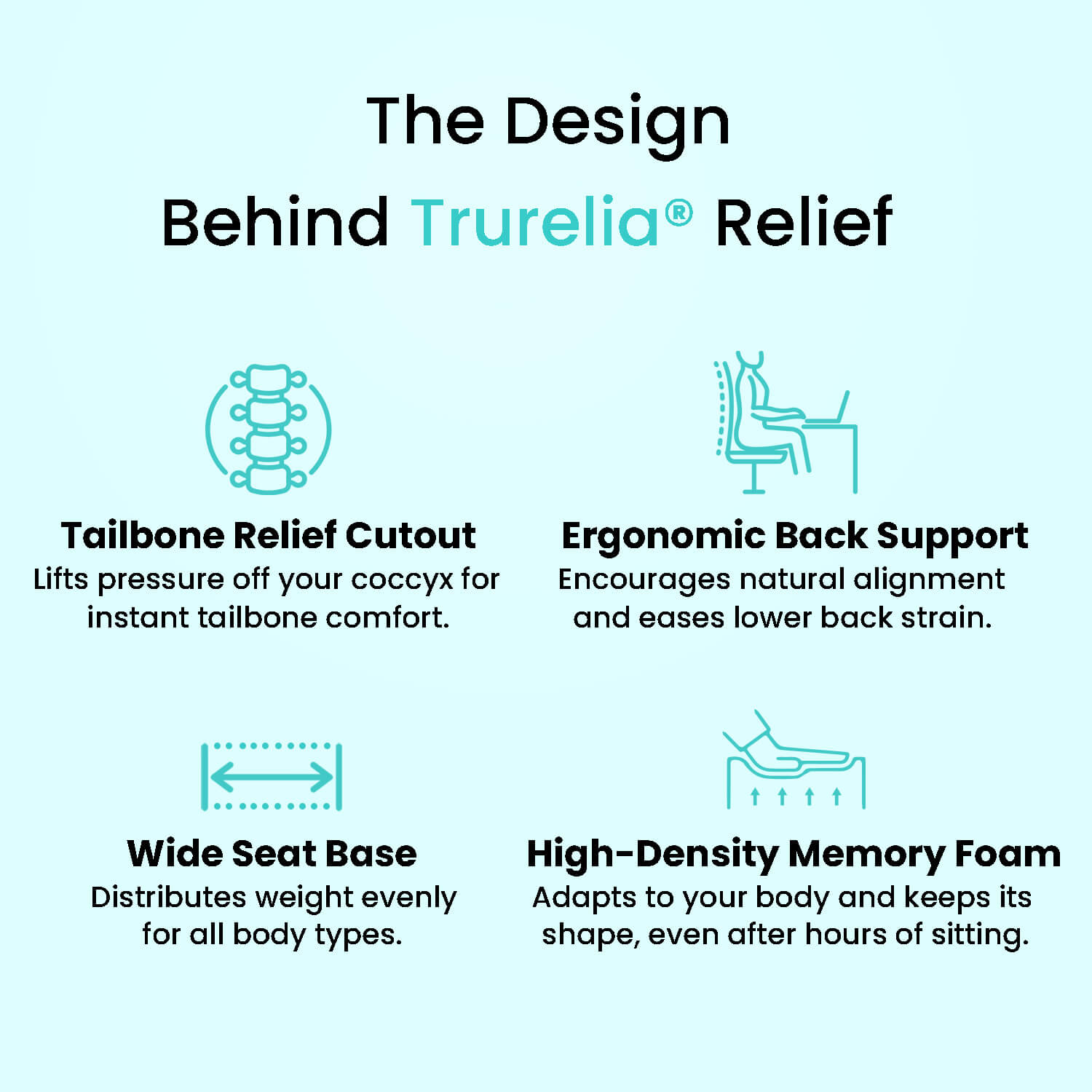 The Trurelia® Seat Cushion uses a clinically inspired coccyx cut-out to remove direct pressure from your tailbone while elevating your hips into a healthier, neutral position. Its contoured design supports the natural curve of your spine, reducing compression and helping you sit longer with ease.